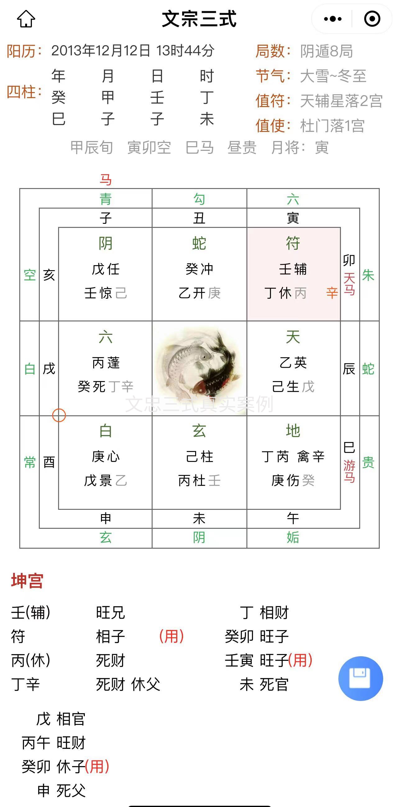 听了女教师的遭遇,我也感到有些唏嘘,于是我让助手起了一个文忠三式奇门遁甲局:
