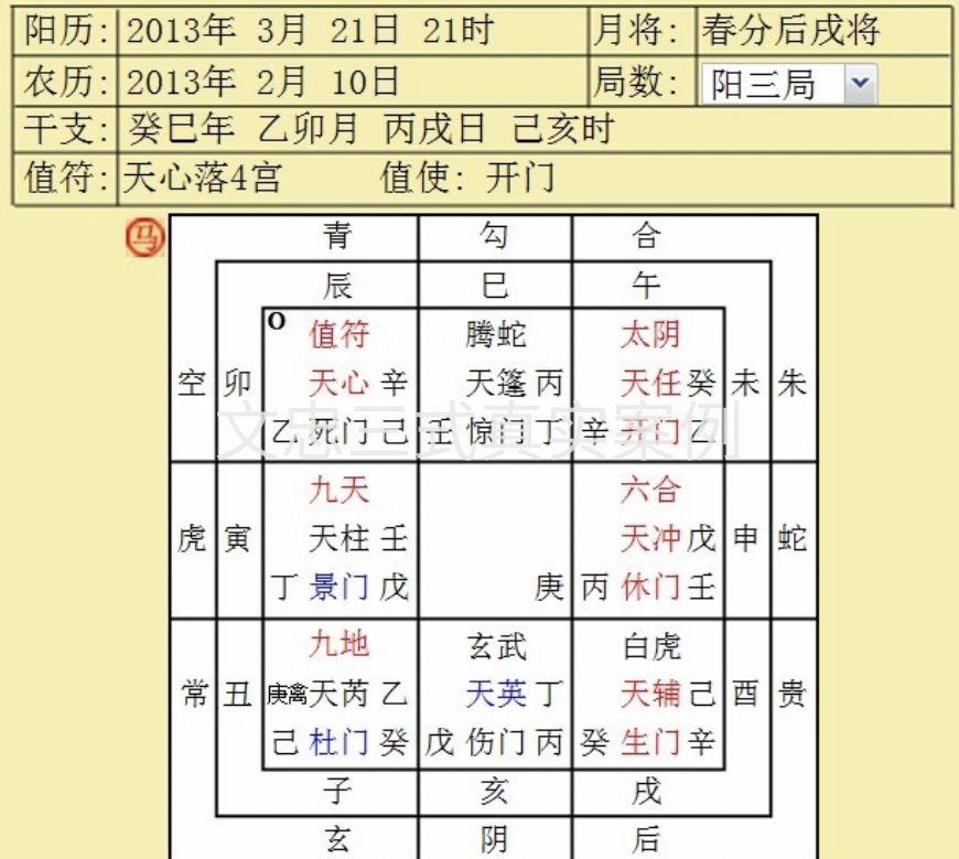 在来找我预测的群体中,几乎有一半是来寻求感情归宿的。初春时节,年轻漂亮的美术老师王小姐给我打来电话,语气很委婉含蓄,"费老师您好!我最近在感情上非常迷茫,您能为我指点一下迷津吗?我一边应允着,一边让我的学生起了一个文忠三式奇门遁甲局。