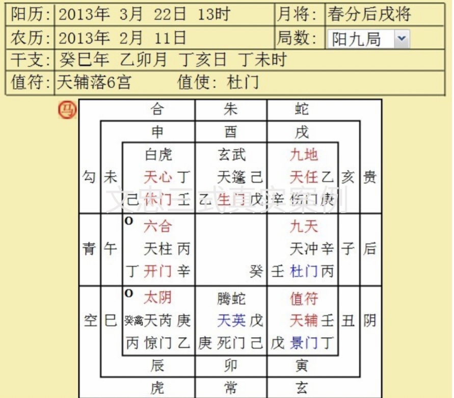 我一边与A女士喧,一边让助手在白板上起了一个文忠三式奇门遁甲局。